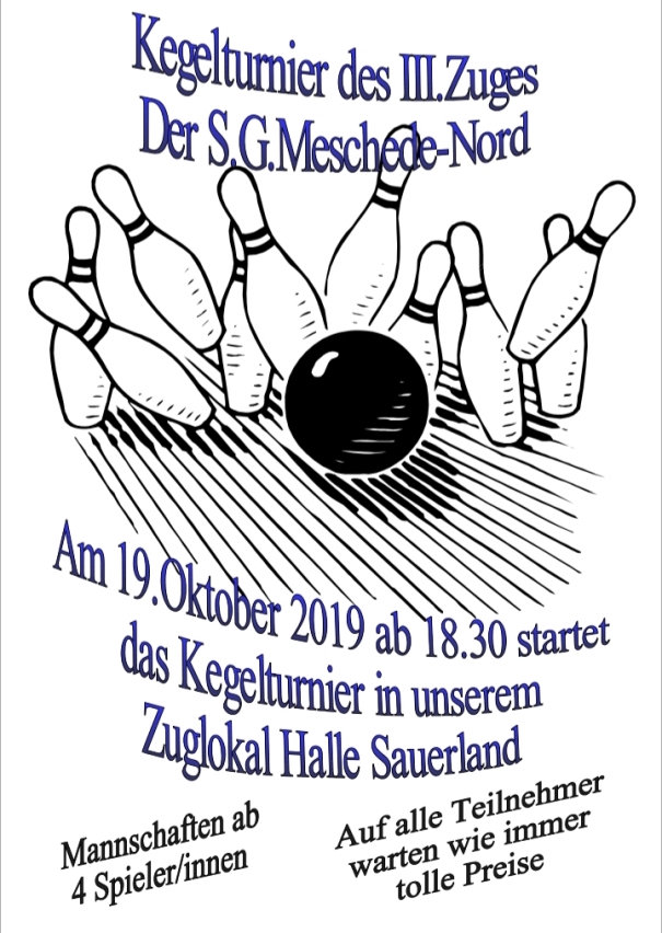 Genau dies gilt es wieder unter Beweis zu stellen! Dazu lädt der Zug 3 am 19. Oktober ab 18.30 Uhr Kegelturnier in der Halle Sauerland zum Kegelturnier ein. Auf alle Teilnehmer warten tolle Preise und ein geselliger Abend. Eine Mannschaft besteht jeweils aus vier Spieler/innen. Zugführer Thomas Heinemann und sein Gremium freuen sich auf euch!